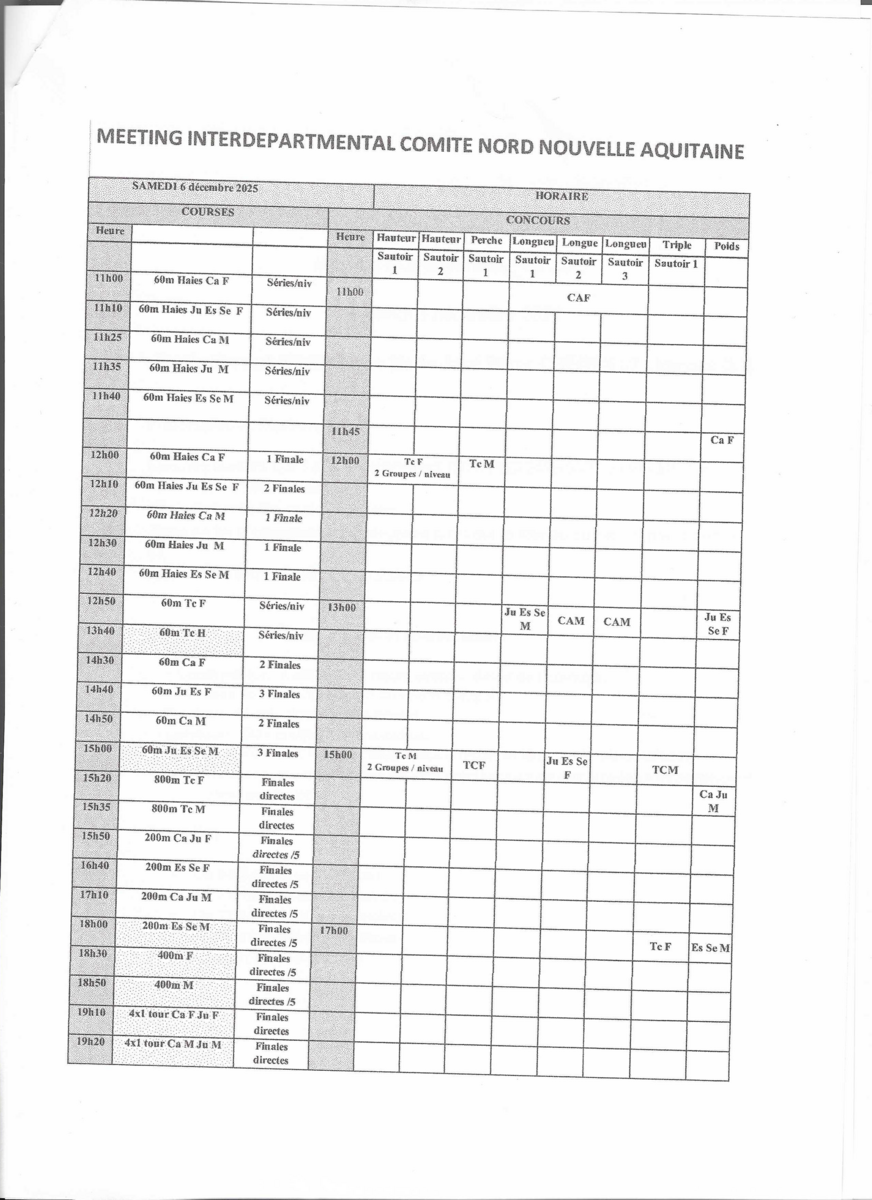 Ci-Joint les horaires du Meeting Interdepartemental Comité Nord Nouvelle Aquitaine 06/12